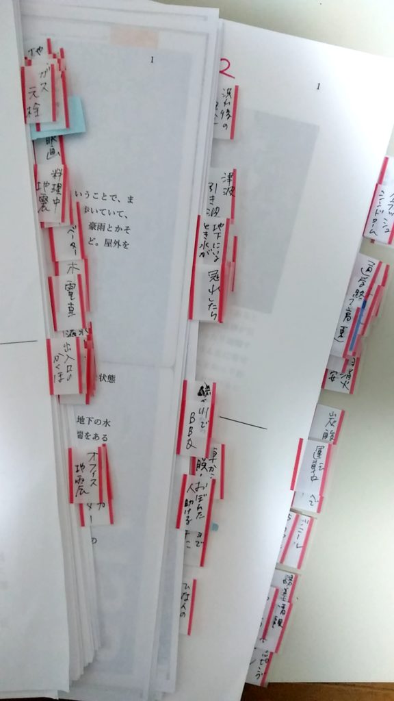 キーワードは、テープ起こし原稿をあとから見る際に、どこに何が書かれているのかがわかる程度でOK。たとえばその書籍のテーマが「防災」なら、キーワードは「オフィスで地震」「運転中に地震」「冠水したら」という具合に書いていきます(写真参照)。